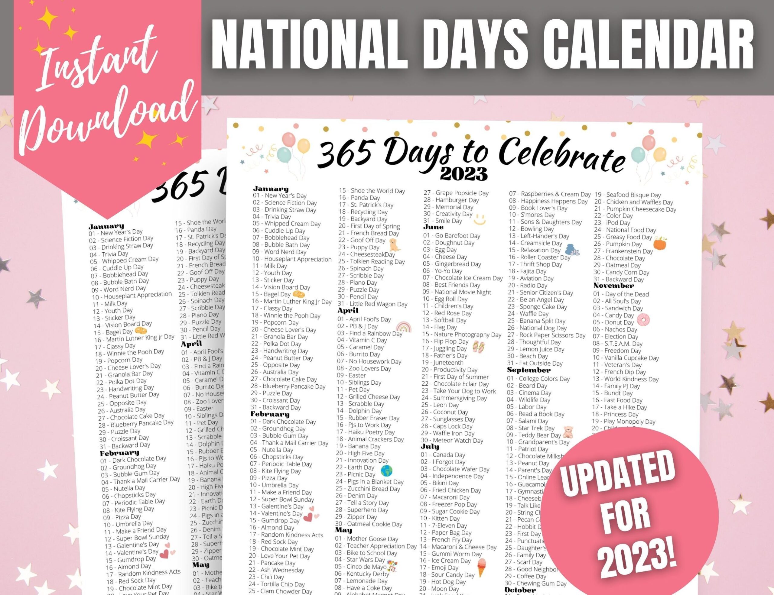 Wir gehen über eine reine Auflistung von the national days calendar is shown on a pink background with stars and hinaus und zeigen dir